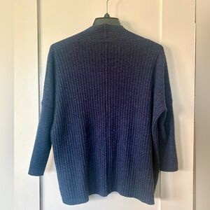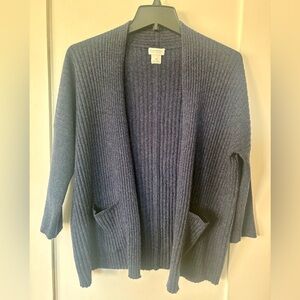 Club Monaco light navy blue cardigan, Italian cashmere, ribbed with shawl collar and dolman sleeves. Two front pockets. Very soft and cozy. **Please note it has some holes like those shown in the detail shots. Due to the ribbed design, they aren’t easy to spot. I’ve marked the condition and priced accordingly.