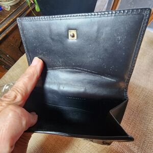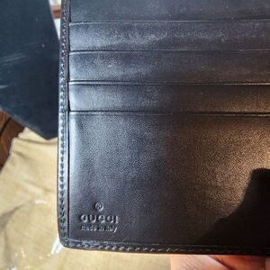 Gucci Supreme Black and GG Canvas and Leather bi-fold wallet featuring black leather trim and the classic black/grey GG canvas monogram pattern. It has a distinctive silver-tone metal bar with the Gucci logo on the front flap closure. 10 card slots 2 slip pockets 2 large bill pockets.This authentic Gucci wallet is in good preowned condition. The canvas is still very nice, but it does show signs of a little fading. the leather still looks really good. There’s only one little area by the silver Gucci tag where it looks like it was setting up against something referred to all pictures. The price reflects any little imperfections that may be here. The trim and edges look amazing! The Guicci number is 035.2091.2151 on an inside slip pocket.