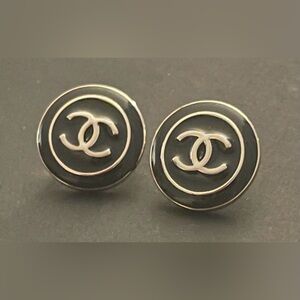 Chic button earrings with iconic logo. Black and cream design. Timeless elegance, add a touch of luxury to your ensemble.