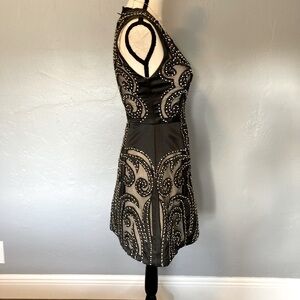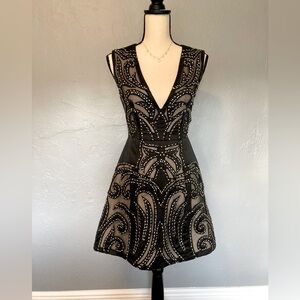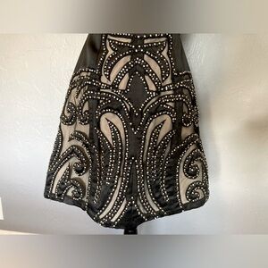 Beaded with silver and black stones. Nude color underneath the lace. Only wore once. Amazing cocktail dress for all occasions.