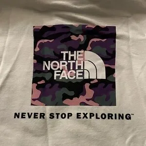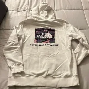 Cozy white hoodie with front pocket. Features The North Face logo on chest. Graphic on back. Drawstring hood. Perfect for casual wear.