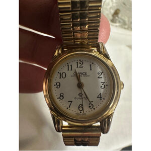 This is a pre-owned Caprice quartz watch. It features a gold-tone base metal bezel and a stainless steel back. The watch has a white face with black numerals and hands. The band is a gold-tone, stretch-style bracelet. The watch is marked as water-resistant to 30M.