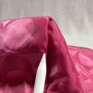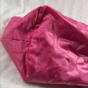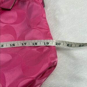 Elegant fuchsia tote with signature Coach pattern. Ideal for daily use. Adds a chic touch to any look. 19.5 inches x 11 inches.