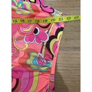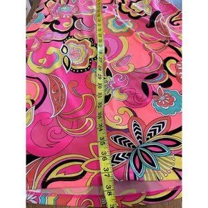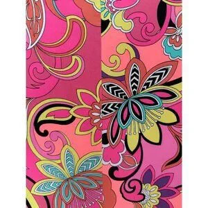 *color: vibrant paisley print in shades of hot pink, yellow, orange, and teal. (A bright, mod-style floral and paisley print with a 60s/70s vibe)