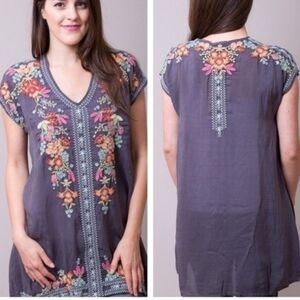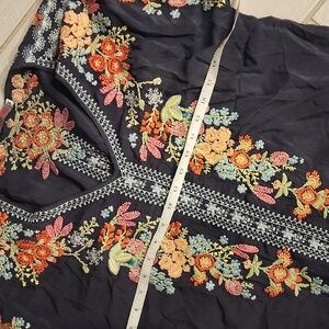 Johnny Was Heidi Tunic in black with multicolor floral embroidery.