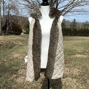 Faux vegan fur trim and hood vest separates from parka by buttoning.