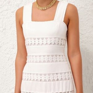 Chic white lace midi dress by Zimmermann. Features intricate lace patterns. Ideal for elegant occasions.