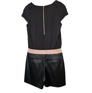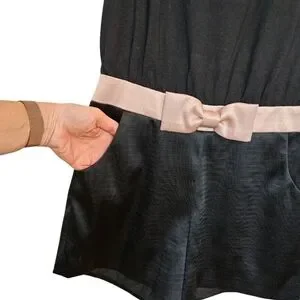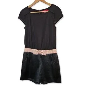 This elegant black romper features a sleek, tailored design accented by a charming pink bow detail at the waist, adding a touch of femininity. Perfect for a variety of occasions, from casual outings to more dressy events. Ted Baker size 4, US 8-10 I believe.