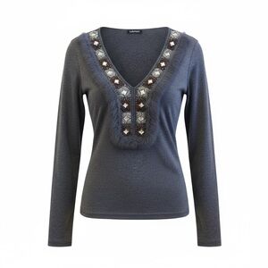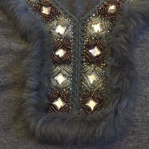 Gray knit top with striking faux fur, gem, and bead embellishments. Beautiful workmanship. Size small and would fit a 2–4. Beads are two tones in silvery clear gray and bronze shiny brown. Stones are faceted diamond colored between the beads. I wore this with tight brown leather pants which was a great look for the holidays. 1 owner.