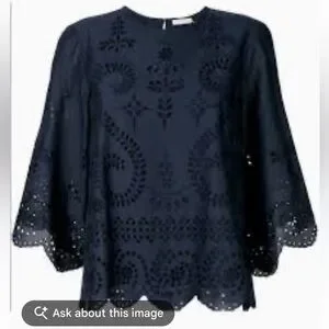 It features wide three-quarter length bell sleeves, intricate eyelet embroidery, and scalloped edges at the cuffs and hem. The blouse is known for its relaxed, swing silhouette and hook-keyhole closure at the back.