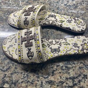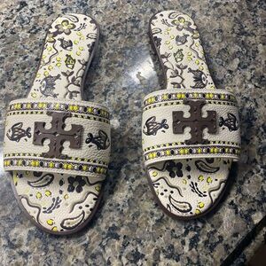 Elegant sandals with cream base and brown floral design. Yellow details enhance the look. Ideal for everyday style.