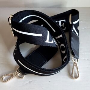 A fun black with white lettering adjustable replacement strap for all types of bags, including totes, shoulder, and crossbody bags