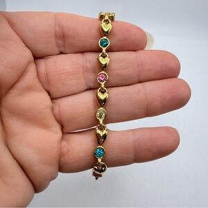 Vintage Gold Tone Multi Color Crystal Rhinestone Bracelet. Features heart shaped links alternating round crystals of pink, blue and clear. Dainty and romantic. Unsigned. Please see all photos for condition and measurements.