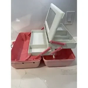 The Vintage Caboodles Large Makeup Case 3 Tier Mirror in Pink, Model 2630, is a nostalgic and collectible piece that was made in the USA. This retro vanity item features multiple tiers for organizing makeup and beauty essentials, along with a built-in mirror for easy application. With its vintage charm and American craftsmanship, this Caboodles case is a must-have for collectors and beauty enthusiasts.