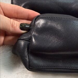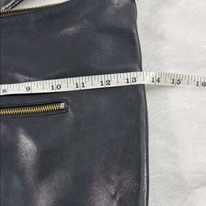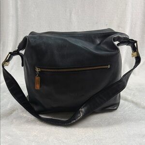 This is a Ralph Lauren black leather shoulder bag featuring a sleek design with a front zipper pocket. The bag is crafted from high-quality leather, offering both style and durability.
