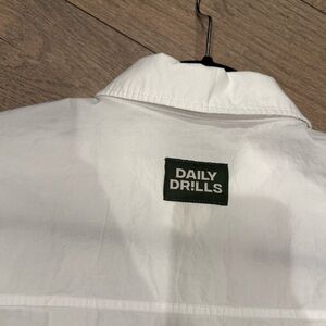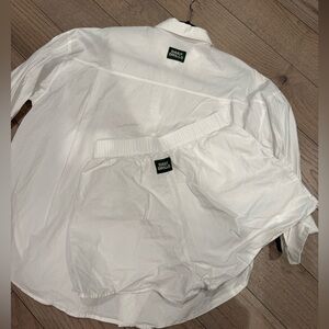 Relax in style with this crisp white set from Daily Drills. Includes a button-up shirt and comfortable shorts. Minor signs of wear.
