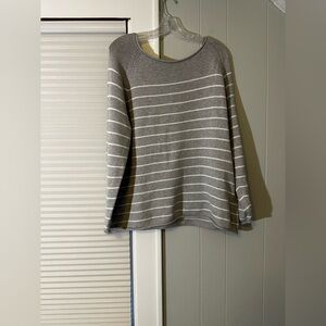 Classic Eddie Bauer lightweight knit sweater in gray with white stripes. Soft, comfortable fabric with a relaxed fit—perfect for everyday casual wear or layering. Excellent used condition.