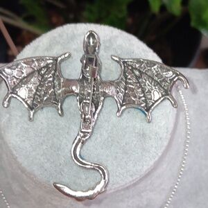 Stunning dragon brooch with blue and silver tones. Features intricate detailing and sparkling accents. (329J)