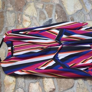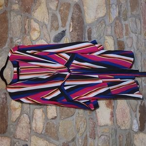 Vibrant stripes make a bold statement on a perfectly draped long-sleeve top cinched with a tie detail at the waist.
