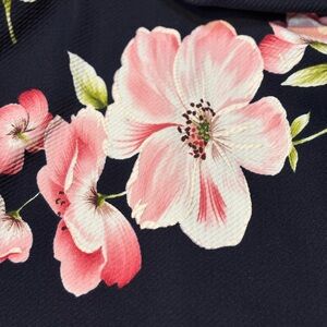 Color/Pattern: Navy blue base with a prominent pink and white floral print.