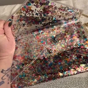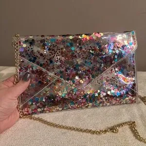 This item is a Packed Party Convertible Confetti Envelope Clutch. This clear vinyl clutch is filled with colorful confetti and features a detachable gold chain to allow it to be worn as a crossbody, clutch, wristlet, or shoulder bag. This type of clear bag is popular for events requiring transparent bags, such as sporting events or concerts