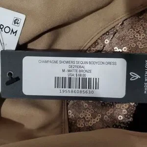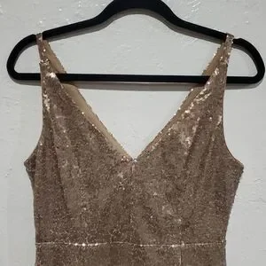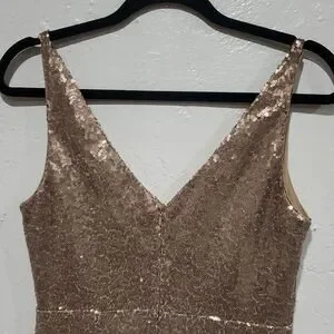 Dazzle in this shimmering gold dress. Perfect for special occasions. Features a stylish v neck and v back design.