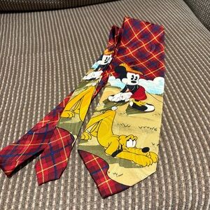 Classic Disney tie with red and blue plaid pattern. Featuring Mickey Mouse and Pluto golfing. Great for any Disney fan!