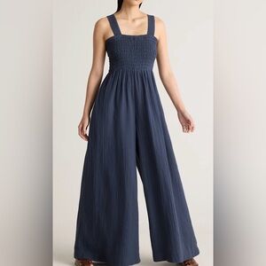 Classic wide leg black Quince jumpsuit for any occasion! This sleeveless jumpsuit features a wide-leg design, smocked details, and is made from breathable organic cotton fabric. The straps are adjustable! Size XL. New with Tags.