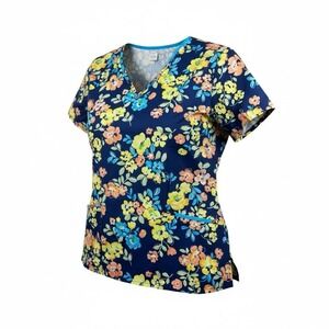 The Scrub HQ Women's Plus Size Scrub Top in navy blue with a vibrant floral design is a stylish and practical choice for medical professionals. Made from a comfortable cotton blend material and featuring a flattering short length, this top is specifically designed for women and comes in a size 3XL. The top showcases a colorful floral pattern, adding a fun and feminine touch to the traditional medical uniform. Proudly made in Vietnam, this scrub top combines quality craftsmanship with a pop of personality for a unique look in the medical field.