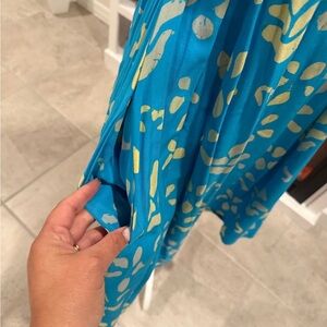This sleeveless sundress features a vibrant blue base with a cheerful yellow floral print, perfect for casual or resort wear. The smocked bodice and scoop neckline offer a comfortable fit, while the flowing midi-length skirt adds a touch of elegance.