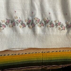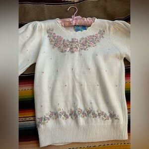 Vintage Margules Ramie and Cotton Sweater w Pink Floral Embroidery