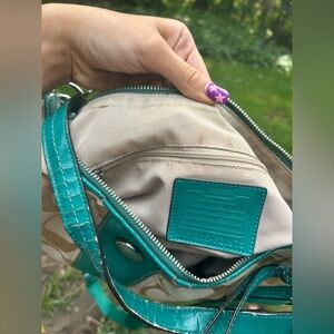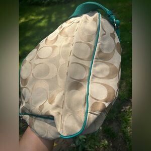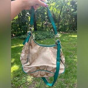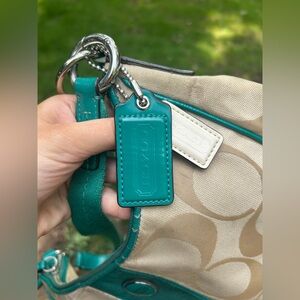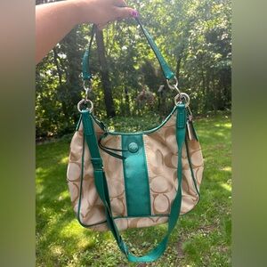 Coach Signature Stripe Convertible Hobo Bag F21873 in Light Khaki Bright Jade