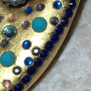 Vintage art pin hand made Swarovski crystals color blue green white gold size 3 inches