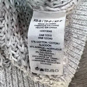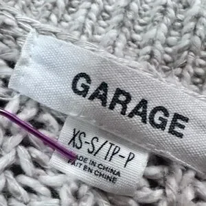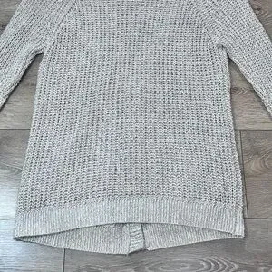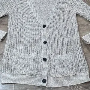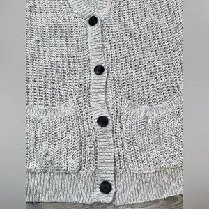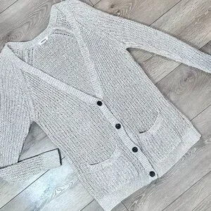 Open knit button down cardigan from Garage. Oatmeal/beige in color. V-neck with 4 buttons down the front. Slouchy fit, but with fitted sleeves. Two front pockets. Made of cotton, acrylic & polyester.