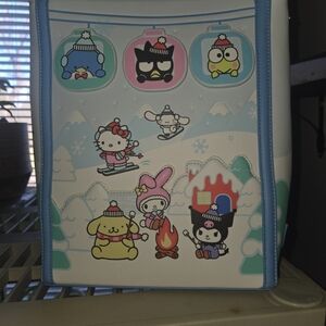 Charming Loungefly backpack with playful character design. Features a winter theme with skiing and snow activities. Perfect for fans of cute and colorful accessories.