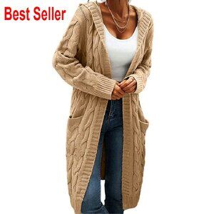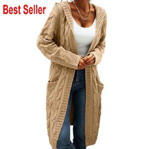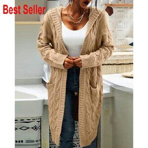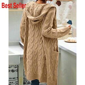 Cable Knit Long Sleeve Sweater Cardigan Open Front Hooded Cozy Chic