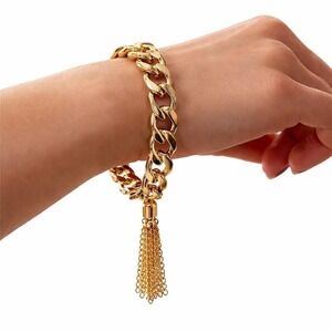 This stunning gold tone chain bracelet features a chic tassel design, perfect for adding a touch of elegance to any outfit. Ideal for both casual and formal occasions.