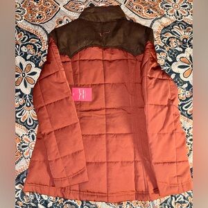 New with tags women’s KIMES RANCH lenora puffer jacket,burnt red color, with suede yoke and collar, SIZE LARGE