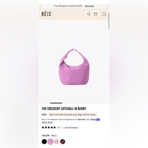 EXTERIOR: Zip closure, BÉIS silicon label, BEIS zipper pullers, 1 zipper pocket with elastic key leash inside, 1 hidden water bottle pocket, 1 removable crossbody strap, and bag converts from crossbody to hand held bag. With adjustable strap removed, shoulder drop is 9".