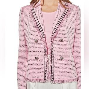 Elegant pink blazer with textured fabric. Features a stylish design with fringe accents. Ideal for both work and casual wear.