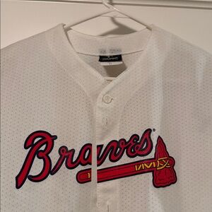 Classic white jersey with bold red details. Perfect for young Braves fans.