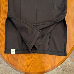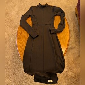 Chic black fitted maxi long sleeve dress with a sleek silhouette by The Giving Movement (Sustainable). Mock turtleneck, 9-inch slits on both sides at hem, stretchy (80% recycled poly, 20% spandex), thumb holes in sleeves. Super fashionable, sleek and sexy. Great for classy evenings, cocktail parties, etc. Very good condition. Size XS
