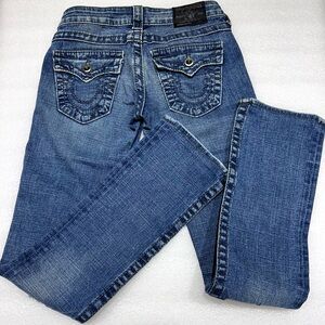 Chic dark blue jeans with distressed details. Straight leg design. Ideal for everyday wear.