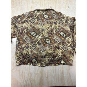 Step back into 90s retro style with this rare Activology silk bomber jacket. Featuring a lightweight 100% silk shell, this piece combines comfort with bold statement style. The standout feature is its equestrian and abstract graphic print in warm tones of brown, tan, orange, and gold – perfect for collectors of vintage streetwear or those looking for a unique layering piece. Small hole in pocket.