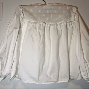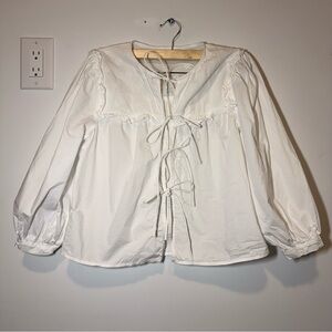 Elegant white blouse with tie-front design. Features subtle embroidery. Long sleeves with gathered cuffs.