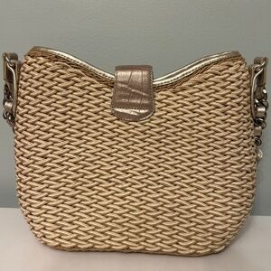 Brighton Jani Straw and Patent Leather Shoulder Bag with Medallion Clasp