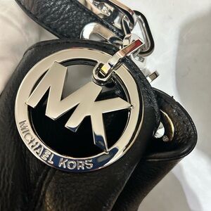 This NWOT Michael Kors Fulton Large Shoulder Bag in black pebbled leather with silver accents is a stylish and versatile accessory for any woman. The rectangular shape, zip and magnetic closure, and double handles make it convenient for everyday use, while the inner pockets and compartments provide organization for travel or business. The signature MK emblems add a touch of designer flair to this classic piece, which is perfect for casual or more formal occasions. Made of high-quality leather and featuring a black fabric lining, this bag is a timeless addition to any wardrobe.