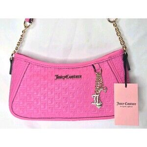 Authentic Juicy Couture pink embossed logo shoulder bag with a crescent silhouette, gold-tone chain strap, and signature charm. Brand new with original tags attached. Clean, unused interior with multicolor lining and pockets.
