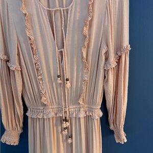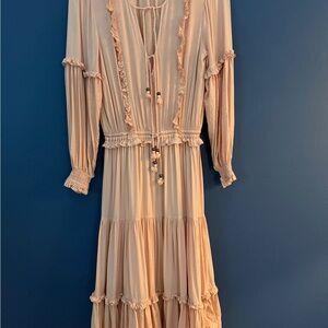 Preloved stunning Spell & The Gypsy Collective Clementine Soirée dress in a musk (pink/blush) color, made from a rayon blend with gold lurex threads elastic waist and wrists , tiered boho with ruffle trims , washed on delicate and air dry ! Ready to wear !