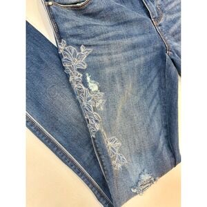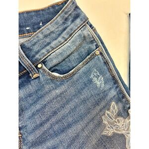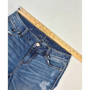 White House Black Market The Skinny jeans in a classic blue wash. These jeans feature delicate white floral embroidery along the sides and legs, adding a unique and stylish touch. Designed with a distressed look and frayed hems, they offer a modern, edgy aesthetic. The skinny fit provides a sleek silhouette. Includes classic five-pocket styling and a button and zip fly closure.